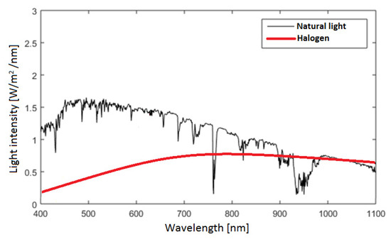 In the measurement setup, the average intensity is Eaverage = 861 W/m2. These data correspond to a value measured on a slightly cloudy day, lower than in clear, sunny weather, which is 1000 W/m2 in Hungary. According to Wien’s law [22], a constant determination is required because there is a significant spectral energy shift between halogen reflector light and natural sunlight. Based on Figure 2, the constant of the light spectral composition is 0.532, which is the quotient of the areas under the curve and determined by a spectrophotometer [1,20,23,24]. It means that with a halogen reflector solar simulator compared to natural sunlight, the measured current is 53.2% of the real one (Figure 2).