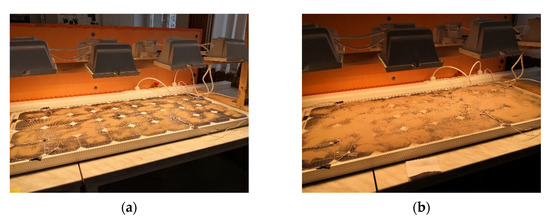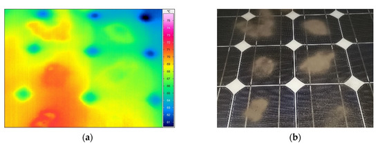 Measurements similar to electroluminescent experiments can also be performed with a thermal capturing camera, in which case the temperature distribution can be observed. The two test methods must show a consistent pattern [31,33], as the resistance of the dark parts seen in the EL images is higher, and thus the temperature increase is higher. Studies of this nature are in progress in our laboratory. Figure 18 shows recordings of measurement of the effect of contaminants. The images were taken during the panel cooling process in a closed box. The lighting has already been switched off. The thermography diagram shows where the dust is, and it appears in much warmer areas. This temperature difference can also be measured with a contact thermometer.