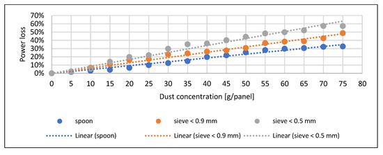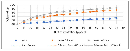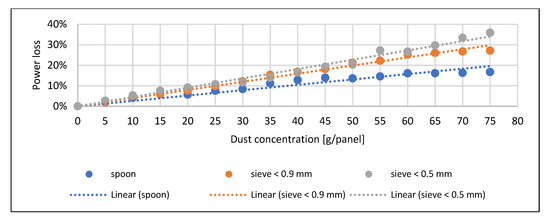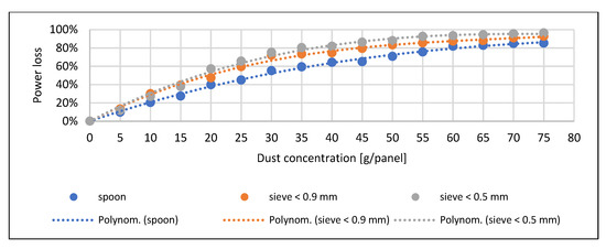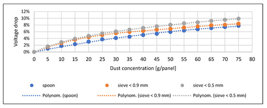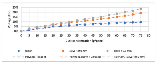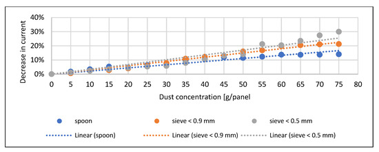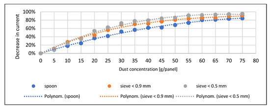 Only at higher concentrations could significant differences be observed, which were already due to the degree of spreading on the surface. In the case of the sand, the finest particle size caused the maximum current reduction. In the case of the soil, the order and pattern of the trend lines correspond to the pre-expected picture. The voltage drop measured when the fly ash spread with a spoon is significantly lower than the results obtained with sieving. This drop can be explained by the fly ash forming a thick thermal insulating layer over the entire surface of the solar cell during sieving (Figure 10). The current decrease and power loss are smaller at higher concentrations due to the early and significant spreading material on the surface due to the density of the material (Figure 11 and Figure 12). Similar trends can be observed in the study of Abderrezek et al. [5], Bhattacharya et al. [18], and Oh et al. [26].