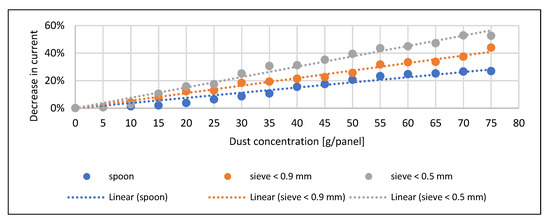 In the case of sand, the maximum voltage drop was 8% (Figure 7). However, in the case of soil, this value was 10% (Figure 4). This difference can be explained by the fact that sand has a brighter surface and reflects more light. As a result, the heat absorption capacity is smaller, and the voltage values are lower than in the case of a clean panel surface. Furthermore, it was more difficult to spread the sand evenly with a spoon than in the case of soil. In the case of sand up to a 30 g/panel concentration, there was no significant difference in current reduction between the different sprinkling modes (Figure 8), as well as in the case of power loss in Figure 9. This can be explained by the fact that there is less variation between the sand particles, with fewer tiny parts than the soil. Similar trends can be observed in the study of Abderrezek et al. [5], Bhattacharya et al. [17], and Oh et al. [25].