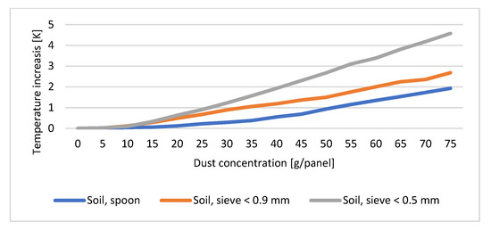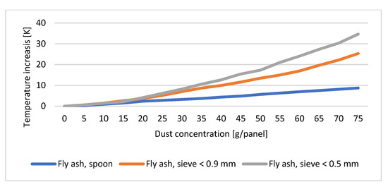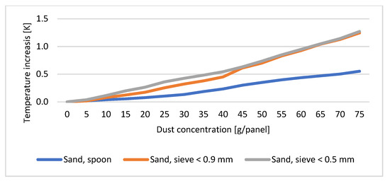 As a result of the soiling, the temperature of the solar cell increased. In addition to the dust concentration, the type and size of the powder (density, heat capacity, and thermal conductivity) also influenced the temperature increase. The temperature of the solar cell contaminated with sand increased the least. Even at the highest dust concentrations, the temperature increase was only 0.5, 1.25, and 1.27 K. For soil-contaminated solar cells, these values are 1.93, 2.68, and 4.58 K. The most drastic temperature rise is by the ash: 8.73, 25.31, and 34.64 K. The difference between the thermal imaging and the contact thermometer measurement was less than 2 K (°C). The following figures illustrate the results obtained (Figure 13, Figure 14 and Figure 15). The trend resulted in what was expected based on the mechanical and thermal properties of each material.