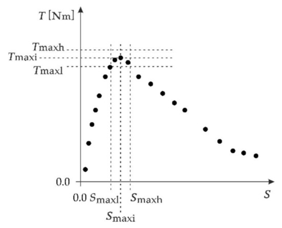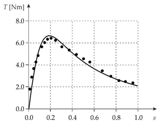 One of the most important curves used to describe the RIMs is the torque-slip characteristic, which represents the relationship between the electromagnetic moment and the slip [3,4]. This is determined by the constant value of the stator supply voltage and the variable rotational speed of the motor, which is related to the slip by a simple and well-known formula. It is most often described using a simplified Kloss equation [3], which approximates the corresponding measured points with a high uncertainty value, however, most often in the case of very low-power machines [5]. An extended version of this equation [6,7,8], denoted here as EKE, was therefore developed based on the theory and practice of electric machines, for which much lower values of the approximation uncertainty of the mechanical characteristic of the motor can be obtained. This equation is necessary for the analytical determination of machine acceleration times [9], an analysis of the transient regimes [10], frequency control of inductive electric drives under conditions of overload [11], and for the testing of electric motors, for example in Tesla vehicles [12]. Using a simplified and extended version of the Kloss equation, the value of maximum (critical) motor torque and the corresponding value of maximum (critical) slip can be determined [13]. For when the slip is equal to one, the value of the starting torque of the motor can be determined. Knowledge of the critical and starting torques is extremely important from the point of view of evaluating the mechanical properties of the RIM [14]. The first type of torque allows us to determine the possibility of short-term motor overload [15], while the second one represents the possibility of starting a drive system including both a motor and a generator [16].