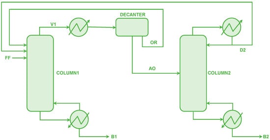 Scheme of the heterogeneous azeotropic separation of the 2-propanol + water mixture: AO, aqueous phase exiting the decanter; B1, bottom product of COLUMN 1; B2, bottom product of COLUMN2; COLUMN1, heteroazeotropic distillation column; COLUMN2, entrainer recovery column; D2, distillate product of COLUMN2; FF, fresh feed; OR, organic phase exiting the DECANTER; V1, vapor stream exiting the top of COLUMN1.