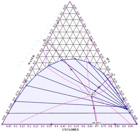 Ternary map at 1 atm, obtained by means of Aspen Plus® V11 [61] using the NRTL model, for the system 2-propanol (IPA) + water (WATER) + cyclohexane (CYCLOHEX).