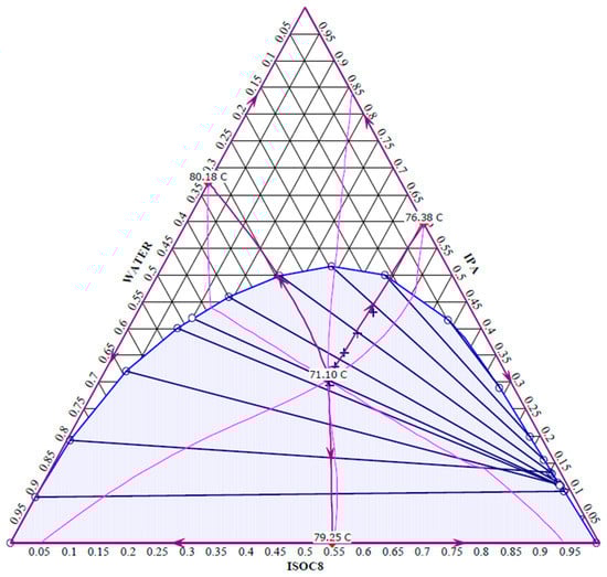 On the contrary, amyl alcohol is not directly comparable to the other entrainers, as it entails the formation of a binary heterogeneous azeotrope, which is not even minimum-boiling: the ternary diagram conformation, shown in Figure 8—and, in turn, the required process configuration—are unavoidably different from the ones envisaged so far (as shown in Figure 2, Figure 3, Figure 4, Figure 5, Figure 6 and Figure 7). Nonetheless, amyl alcohol might be considered as a potential solvent, with its own process configuration, and it might turn out to be even better than benzene, cyclohexane and isooctane, as the water content in the aqueous phase exiting the decanter would be approximately equal to 100%. However, a conflicting aspect has to be unavoidably considered: because the homogeneous 2-propanol + water (67.28–32.72% mol) azeotrope is characterized by a normal boiling point temperature of 80.18 °C, the 2-propanol, with a normal boiling point temperature of 82.05 °C, corresponds to a saddle point. It is, thus, evident that a process configuration involving amyl alcohol as an entrainer cannot work: if we are trying to simulate the heterogeneous azeotropic distillation column in order to obtain the required alcohol from the top and the heteroazeotrope from the bottom, it would not be possible to reach a distillate composition beyond that of the 2-propanol + water homogeneous azeotrope.