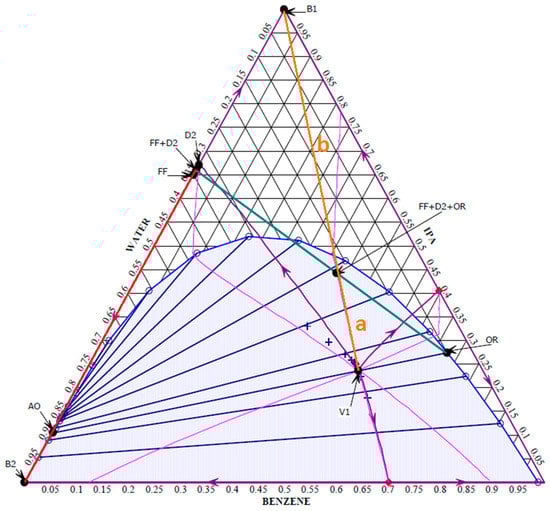 According to Luyben and Chien [39], the comparison of entrainers’ performances has to be carried out by making particular reference to the material balance lines associated with the process inside the ternary maps. As a matter of fact, if we are considering an ideal case, as illustrated in Figure 1, for the separation of the fresh feed (FF), the bottom stream (B1) of the heteroazeotropic column (COLUMN1) reaches the composition of pure 2-propanol, whilst the top vapor stream (V1) approaches the ternary azeotrope. The stream D2, instead, exiting the top of the recovery column, is located at the distillation boundary. Thus, with reference to such an ideal case, the flowrate of the vapor stream from the top of the heterogeneous azeotropic column can be estimated by means of Equation (1), where b and a are obtained by drawing a line between the summation point FF + D2 and the organic reflux exiting the decanter (OR), and a line between B1 and V1 inside the ternary diagram: