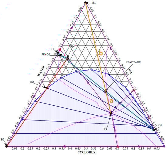 Ternary map at 1 atm for the system 2-propanol (IPA) + water (WATER) + cyclohexane (CYCLOHEX), showing the points corresponding to the streams involved in the process shown in Figure 1, the material balance line for the HAD column (in orange), segments a and b for the calculation of the V1 flowrate (Equation (1)), and the material balance line for the recovery column (in red).
