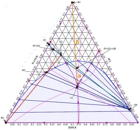 Ternary map at 1 atm for the system 2-propanol (IPA) + water (WATER) + isooctane (ISOC8), showing the points corresponding to the streams involved in the process shown in Figure 1, the material balance line for the HAD column (in orange), segments a and b for the calculation of the V1 flowrate (Equation (1)), and the material balance line for the recovery column (in red).