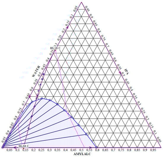 Ternary map at 1 atm, obtained by means of Aspen Plus® V11 [61] using the NRTL model, for the system 2-propanol (IPA) + water (WATER) + amyl alcohol (AMYLALC).
