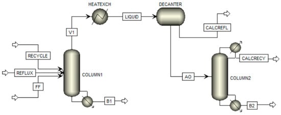 Several studies have been published on the subject of HAD, with particular reference to advantages and disadvantages, heterogeneous phase diagrams, residue curve maps and column sequencing [12,14,15,16,17,18,19,20]. Furthermore, the optimization, dynamics and control of the process configuration have been addressed [21,22,23,24,25,26].