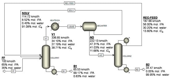 Flowsheet of the HAD process simulated in Aspen Plus® V11 [61] for the separation of the mixture 2-propanol (IPA) + water using isooctane (iC8) as an entrainer (with the two loops related to the recycle streams closed).