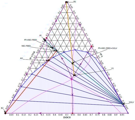 Figure 11 summarizes the results obtained by making reference to the ternary map for the system under study: the points corresponding to the various streams in Figure 10 as well as the material balance lines for the two columns are shown.