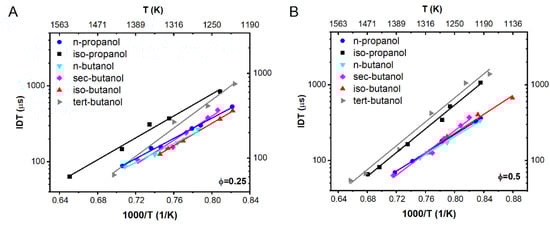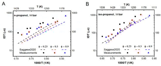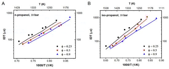 IDTs of (A) n-propanol, and (B) iso-propanol measured in the HPST at 10 bar and ϕ = 0.25, 0.5, and 0.9.