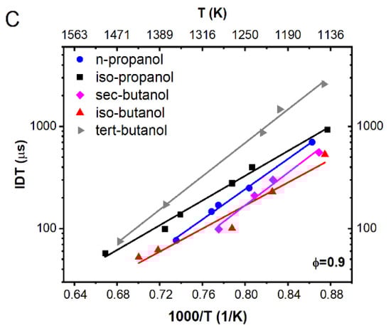 Figure 2 represents the measured ignition delay times (IDTs) of propanol and butanol in the HPST at 1100–1500 K, three equivalence ratios 0.9, 0.5, and 0.25, at 90% dilution and pressure of 10 bar along with the linear fitted lines. In general, all measured IDTs at different conditions decrease monotonically with increasing temperatures and present a clear Arrhenius temperature dependence, which indicates that no NTC effect is observed in the investigated conditions. The IDTs of tert-butanol are apparently longer than the former ones and n-butanol has the shortest IDTs, and tert-butanol shows higher activation energy than other butanol isomers and both propanol isomers at all equivalence ratios, whereas n-butanol has the lowest activation energy compared with other targeted fuels. The order of the reactivity among propanol and butanol isomers is consistent under all investigated conditions, namely, n-butanol > iso-butanol ≅ sec-butanol > n-propanol > iso-propanol > tert-butanol. Moreover, the results of our experiments are in accordance with previous studies by Man et al. [] and Stranic et al. [] on IDT of propanol and butanol isomers, respectively.