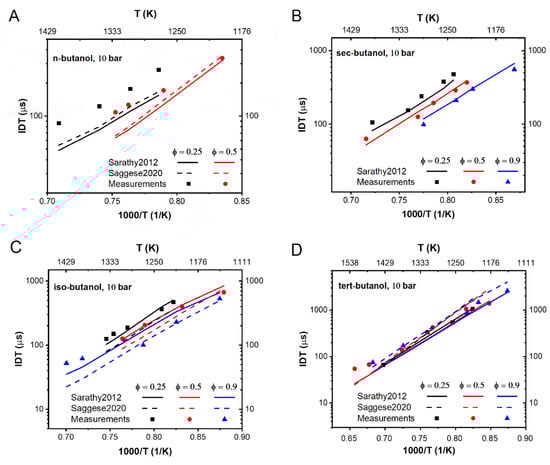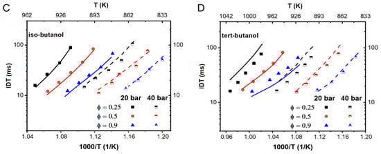 IDTs of (A) n-butanol, (B) sec-butanol, (C) iso-butanol, and (D) tert-butanol measured in the RCM [,,] at 20 and 40 bar and ϕ = 0.25, 0.5 and 0.9. (Symbols: experimental points; Lines: model predictions).