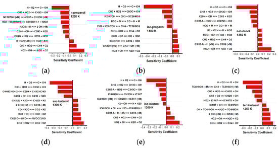 Sensitivity coefficients of the IDT at 10 bar and ϕ = 0.25 based on the C4 mechanism with 3402 reactions for (a) n-propanol at 1250 K, (b) iso-propanol at 1400 K, (c) n-butanol at 1350 K, (d) sec-butanol at 1300 K, (e) iso-butanol at 1300 K, (f) tert-butanol at 1250 K.