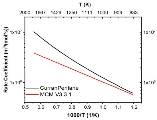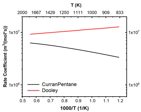 Since the sensitivity coefficients corresponding to C3H5-A + HO2 <=> C3H5O + OH reaction for the investigated fuels are negligible at a low temperature, modification of the reaction rate does not disturb the predictability of the mechanism at low temperature. The reaction rate adopted in the Sarathy2012 mechanism is reported in a mechanism from Dooley and co-workers []. Substitution of the given rate coefficients with one adopted in the CurranPentane mechanism improved the model in the prediction of IDTs at a high temperature significantly. This reaction is provided in the CurranPentane mechanism as a pressure-dependent reaction, while five different rate expressions were specified at five specific pressures from 0.01 to 100 atm. Figure 7 shows the comparison between the rate coefficients of C3H5-A + HO2 <=> C3H5O + OH reaction based on two different mechanisms in terms of temperature from 830 to 1795 K at 10 bar. As discussed before, the lower rate coefficient of this reaction from the CurranPentane mechanism does not have an influence on the predictability of the mechanism at low temperature.