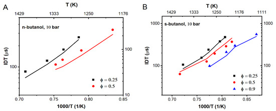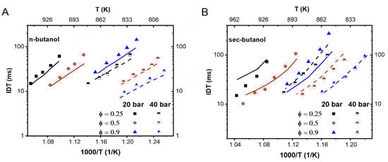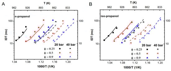 IDTs of (A) n-propanol and (B) iso-propanol measured in the RCM [,,] at 20 and 40 bar and ϕ = 0.25, 0.5, and 0.9. (Symbols: experimental points; Lines: model predictions).