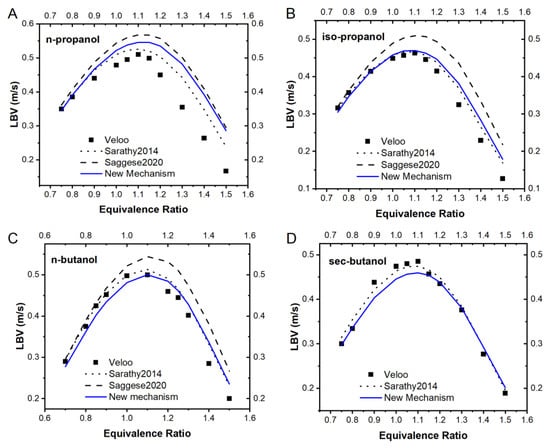 Beside ignition delay, laminar burning velocity (LBV) is another key combustion property. To validate the C4 mechanism for the use in simulations of laminar burning velocity, experimental data of laminar burning velocity were taken from Veloo et al. [] for C4-alcohols, and Veloo et al. [] for C3-alcohols. These data and the simulation results from Sarathy2014 [], Saggese2020 [] and the newly developed C4 mechanism are compared in Figure 12.