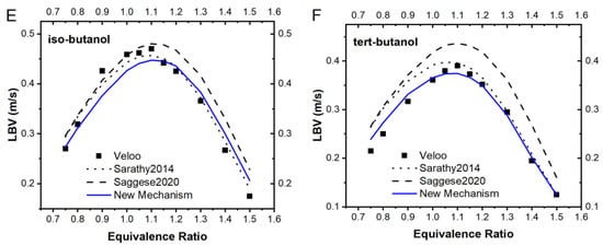 Laminar burning velocity of (A) n-propanol, (B) iso-propsanol, (C) n-butanol, (D) sec-butanol, (E) iso-butanol, and (F) tert-butanol at 343 K in air at P = 1 bar. Symbols represent experimental data from Veloo et al. [].