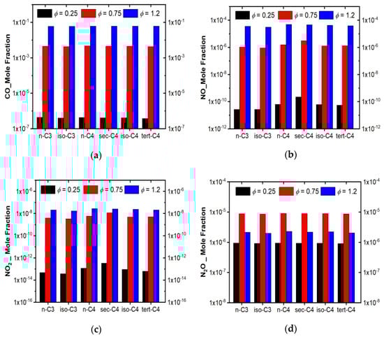 Model prediction for the final mole fraction of (a) CO, (b) NO, (c) NO2, and (d) N2O emissions from the oxidation of propanol and butanol isomers during the ignition process at 860 K and 36 atm for the unburned fuel/air-mixture.