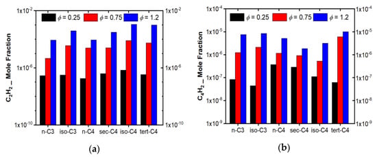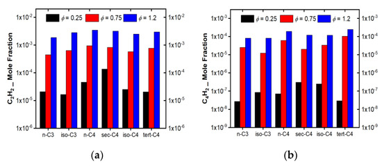 Further gas-phase kinetics modeling was performed to compare the formation of soot of targeted fuels at different ϕ for the engine-related conditions. In this respect, the kinetic modeling of the formation of acetylene (C2H2) and diacetylene (C4H2) was taken into account as the soot precursors [,]. Figure 15 compares the maximum mole fraction of soot precursors, including C2H2 and C4H2 at different equivalence ratios and the engine-related conditions for all fuels calculated by the chemical kinetic model during the ignition process, illustrating the highest emissions at the fuel-rich condition and the lowest emission at ultra-lean condition.