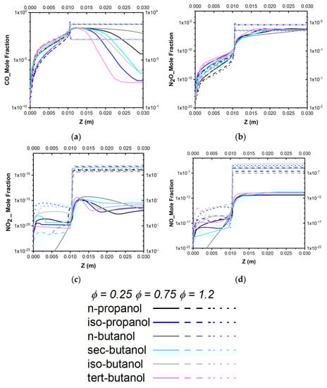 The production and emission of NO, NO2, N2O, and CO in terms of the length of a free flame can be seen in Figure 16. It is notable, that the flame fronts and main zone of reaction of each of the alcohols are in a similar position at Z = 0.01 m. While at ϕ = 0.75 and ϕ = 1.2 the pollutant formation occurs over a short distance and thus in a short time, at ϕ = 0.25 the mole fractions of the pollutants under consideration stabilize after this point.