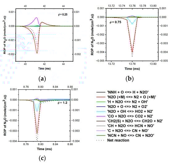 Contrary to expectations, the kinetics modeling of ignition and free flame showed that the final mole fraction of N2O is the highest at ϕ = 0.75 compared to those of at ϕ = 0.25 and 1.2, whereas the model predicted a lower amount of N2O at ϕ = 0.25. This inconsistency may be due to the different rates of the dominant reactions at each equivalence ratio. For this reason, the N2O net rate of production (ROP) in the autoignition of tert-butanol, as an example, from time zero to the end of ignition were analyzed employing the chemical kinetic model (Figure 18).