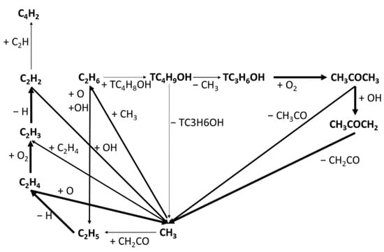 Despite the absolute concentration of both C2H2 and C4H2 radicals are low at lean conditions, it is worth observing the reaction pathway for their consumption and production. Figure 19 presents the main reaction pathways for the formation of C2H2 and C4H2 in the oxidation of tert-butanol process at the engine-related condition and ϕ = 0.75 with the C4 mechanism. The thickness of the arrows implies the rates of the specific pathway, considering the thicker the arrow, the higher the rate of reaction.