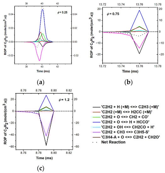 ROP analysis of C2H2 for the oxidation of tert-butanol at (a) ϕ = 0.25, (b) ϕ = 0.75 and (c) ϕ = 1.2.