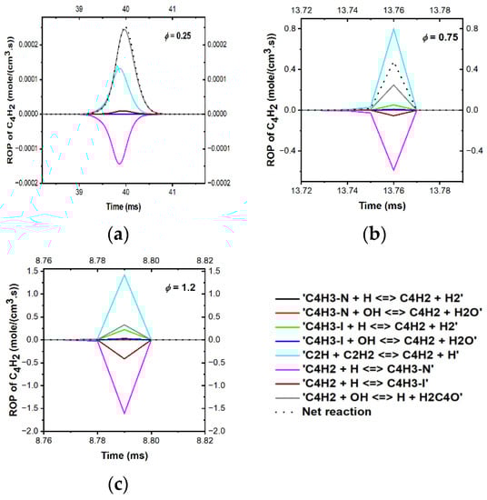 In our newly developed C4 mechanism, diacetylene participates in eight elementary reactions taken from the Sarathy2012 mechanism (Figure 21). The numerical modeling for the C4H2 ROP proved that reaction of diacetylene and hydroxyl radical is of greater significance at ϕ = 0.25, while this reaction is the third significant reaction at ϕ = 0.75 and 1.2. On the other hand, the production of C4H2 through the reaction between C2H2 and C2H, and the decomposition of C4H3-N are more crucial at ϕ = 0.75 and 1.2, whereas the rate of these two reactions is in the same magnitude at ϕ = 0.25 and 1.2. The reaction between C4H3-I and H plays a considerable role at ϕ = 0.75 and 1.2 with a higher rate at ϕ = 1.2, while the rate of this reaction is negligible at ϕ = 0.25.