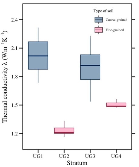 The thermal conductivity (λ) of Tabasco coastal soils varied between 1.17 and 2.32 W m−1 K−1 (Table 4) and showed no specific trend with depth. These values are relatively high and fall within the range reported in the literature for saturates soils [41]. The above may be due to the presence of minerals with high thermal conductivity (i.e., quartz, actinolite, and halite). In general, sandy soils (UG1 and UG3) had greater thermal conductivities and exhibited greater dispersions than clayey strata (UG2 and UG4) (Figure 6). To contrast this hypothesis, a one-way unbalanced analysis of variance (ANOVA) was conducted. Levene’s test indicated unequal variances for the strata (F(3,21) = 3.907, p-value = 0.023), and thus a Welch’s ANOVA [42] was selected. The results showed that there was a significant difference between the mean thermal conductivity of the four strata (F(3.68) = 49.43, p-value = 5.05 × 10−5). Post-hoc multiple comparison tests using the Games–Howell method [43] indicated that , where , , and are the mean thermal conductivity of UG2, UG3, and UG4 strata, respectively. However, the mean thermal conductivity of UG1 and UG3 strata did not differ significantly. Considering the above, the soil samples were classified into two groups for further analysis: (a) coarse-grained (UG1 and UG3), and (b) fine-grained soils (UG2 and UG4).