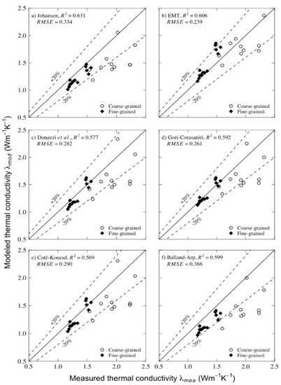 is the mean of the predicted thermal conductivities, is the mean of the measure thermal conductivity, and N is the number of data. The coefficient of determination (R2) varies between 0 and 1 and measures the proportion of variance of the measured values explained by the model. RMSE is an estimator of the standard deviation of the residuals (difference between the predicted values and the measured data); the smaller the RMSE value, the better the estimation.