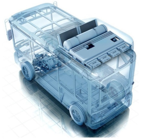 Sketch of a zero-emission light commercial vehicle with a fuel cell range extender mounted on the roof [21], reproduced with permission from e.GO REX GmbH.