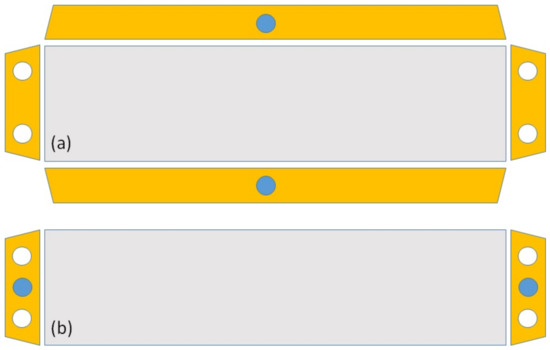 Another geometric requirement for the flow field plates is that the internal structure must match the arrangement of the stack manifolds. In principle, there are two possible arrangements of the stack manifolds, as is shown in Figure 3. It is obvious that the arrangement in Figure 3a, with the coolant manifolds on the sides, will require more space. From the target application, a maximum compactness is desired. Therefore, the solution presented in Figure 3b is chosen. A similar arrangement was also followed in the works of Janßen et al. [25], Giacoppo et al. [57], and Asanin [43]. This choice adds a further geometric constraint to the head and tail region of the cell, wherein the flow of the three fluid regions for the anode, cathode, and coolant must be spread out as evenly as possible over the active area and re-collected at the end into the outlet manifolds.