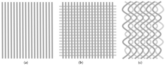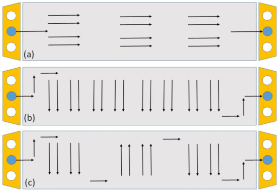 Sketch of common channel configurations for visualization of the contact area: (a) parallel, superimposed; (b) parallel, criss-crossed; and (c) wave-like, mirrored.
