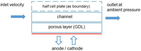 For the screening process of new designs, a strongly simplified ’fuel cell model’ has been used. The electrochemical reaction is mimicked as a constant mass sink/source at the interface of the porous transport layer (gas diffusion layer (GDL)) to the catalyst layers. Simulations are carried out for the anode and cathode plates separately. The sketch shown in Figure 6 demonstrates this configuration. The result of such simulations is an estimation of the pressure differences and the general flow distribution along the channels, as well as under the land area. These results are not intended to give exact numbers, but they are useful as first estimates. Furthermore, different channel configurations can be compared, and the overall quality of the flow distribution can be assessed. The correct distribution of water vapor between cathode and anode side depends on the local osmotic drag factor and water back diffusion through the membrane. A forward prediction of the water distribution is very challenging, even for advanced fuel cell models. Therefore, the model does not consider the consumption of species but, rather, solves the balance of mass instead. All product water is attributed to the cathode side, where the consumption of oxygen and the production of water vapor lead to an influx of fluid at the interface of the GDL (see Figure 6). On the anode side, the consumption of hydrogen is simulated by an outlet condition. All results were obtained under the assumption that the diffusion of hydrogen and oxygen is fast enough to avoid local depletion.