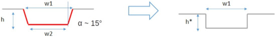 Realistic channel cross section and equivalent model cross section with identical hydraulic diameter. h and h*–channel depth; w1–channel top width; w2–channel bottom width.