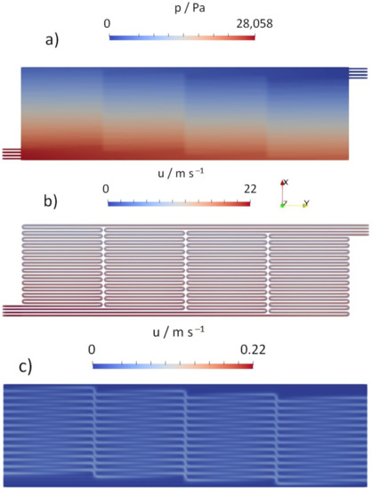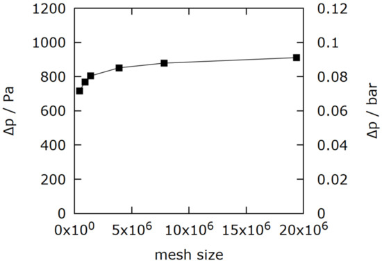 The simulations were performed on a single PC with an Intel i9 processor and 64 GB RAM. The memory requirement for geometries of 10 cm is expected to require ten times as much memory compared to that presented in Table 4. The resulting pressure differences between inlets and outlets of the plate are shown in Figure 9.