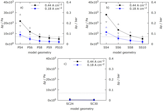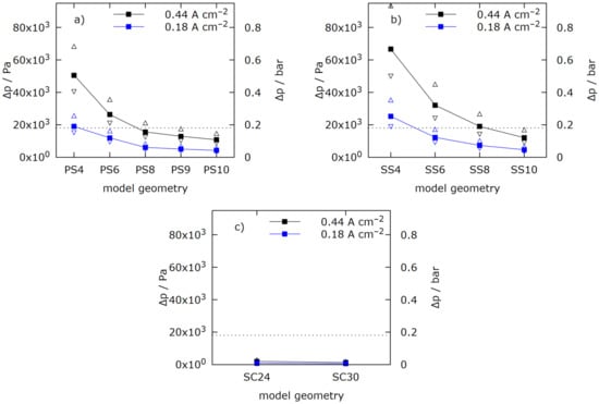 The properties of the GDL are shown in Table S1 (in the supplementary) and consist of averaged values for typical GDL materials [58,59]. The choice of these parameters comes with a high degree of uncertainty, as these values depend on the specific material, which was not defined at the beginning of the screening process. Furthermore, the effects of local compression under the land area and intrusion into the channel are not explicitly considered. A variation in the specific permeability will lead to a modification of the total pressure difference. It was shown in a previous study by Reimer et al. [60] that there exist two different scenarios. As long as the channel depth is larger than the GDL thickness, the impact of permeability on is low. If the channel depth is smaller, the main flow must pass more through the GDL, and the impact on can be significant. For the present plate design, the situation may fall just in between these two scenarios.