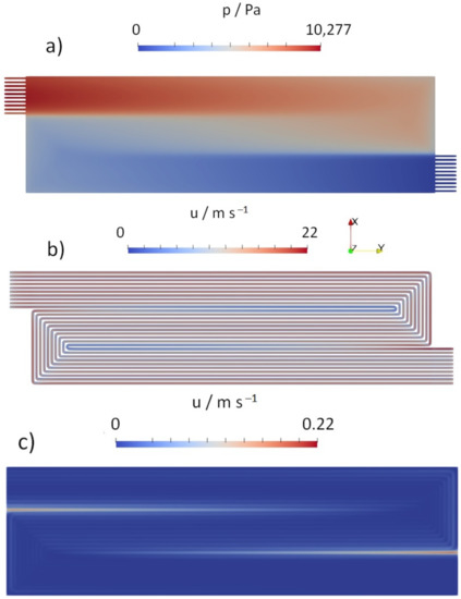 The CFD simulations were carried out using the free software package OpenFOAM [61,62]. For geometry and mesh generation, the toolbox of Reimer et al. [60] was employed, which relies on the free software SALOME [63] and generates flow fields for half cell configurations, i.e., channels and porous transport layer. The toolbox was extended to automatically generate the three different channel configurations shown in Figure 7. These examples are also documented in the supplementary information of this study. The serpentine shapes were chosen because they provide good under the rib convection as a result of the pressure difference of adjacent channel sections [64,65,66,67]. A detailed description of the pressure differences for the separate serpentine flow field can be found in the PhD thesis of Bendzulla [68].