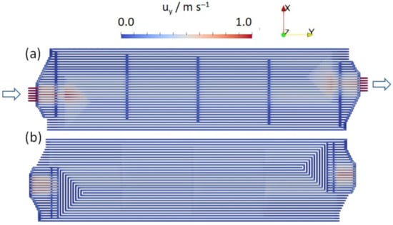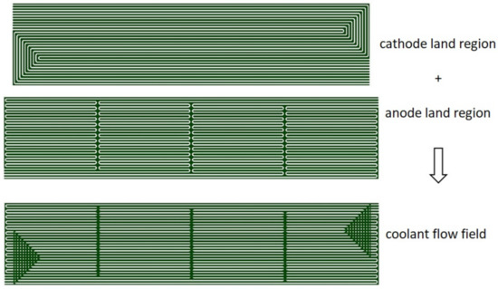 It must be guaranteed that the coolant is able to flow from inlet to outlet. Therefore, blockages may only occur on one plate, but not at both anode and cathode plates at the same position. For the co-flow configuration from Figure 4a, the channels of the anode and cathode plate should be mostly straight, superimposable and have little perpendicular blocking in the main flow direction. This concept has the advantage that a desired temperature gradient can be generated or compensated for by leading the coolant in co-flow or counter-flow direction. For the cross-flow configuration in Figure 4b, the channels must not be superimposable. A wave-like pattern would be advantageous, as discussed by Matsunaga et al. [55], for the HONDA FCX Clarity system. This choice also leads to the need to distribute the coolant from the broad side, which would, in turn, be more suitable for the manifold configuration shown in Figure 3a. The cross-flow configuration in blocks (Figure 4c) is, in principle, a variation of Figure 4b that combines the idea of cross-flow at the level of channels while effectively leading the coolant in co-flow or counter-flow with hydrogen and air.
