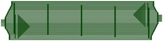 The next step is the separate design screening for the anode and cathode plate. By looking at the three basic shapes in Figure 7, it becomes clear that the total width of the flow field is in fact a function of the number of channels and U-turns for the serpentines. The overall geometry of 50 mm by 200 mm from Table 1 was, therefore, taken as a rough guide. Again, the width of the active area is considered to equal the maximum distance from the first channel to the last, i.e., a three-channel configuration would span three times the channel width plus two times land width.