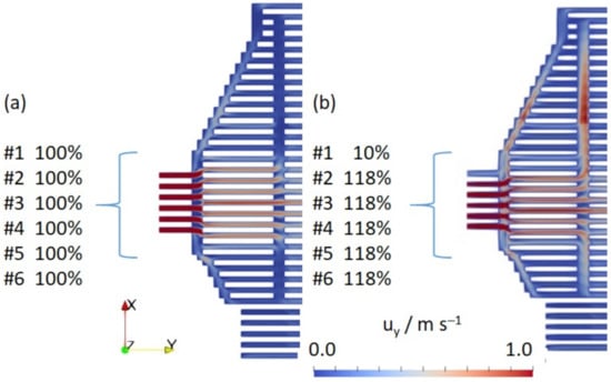 The influence of the blockage of one inlet channel can be assessed by comparing the left and the right side of Figure 19. In short, there is no difference except for the distribution close to the inlet at position A. The flow distribution for conditions FULL and MIN is similar, as shown in Figures S6 and S7. Therefore, the following points can be concluded. First, the flow distribution for the coolant is as perfect as possible. In the middle of the flow field, a very even distribution is observed that changes towards the inlet and outlet manifolds. Secondly, the flow distribution is very robust and does not change significantly as a function of the total mass flow. Even the blockage of one inlet channel has no influence.