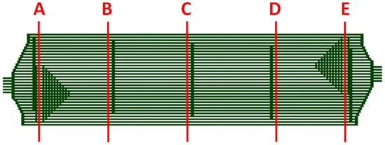 The overall production process combines the techniques of calendering, laser welding, laser cutting, coating, and stack assembly. Each production step adds some requirements to the final flow field plates, as summarized by Porstmann et al. [22]. In general, there are two different design options for bipolar plates, which depend on the plate material. There are compact plates (mostly graphitic) where structures may be milled or thin metallic plates which can be stamped [22,23]. For graphitic plates, it is possible to design the flow fields for anode, cathode and coolant more or less independently. In the case of plates made from thin metal sheets, it is possible to integrate cooling into the plate design of the anode and cathode. Here, each plate defines the gas flow field on one side and half of the coolant flow field on the back side [23,24,25]. The final cell plate consists of an anode plate and a cathode plate welded together and is, therefore, called a double-plate concept. This adds additional complexity to the overall design process, as the combination of two plates yields three different flow fields. Figure 2 shows a cross section of such an arrangement and aptly demonstrates that the final arrangement is highly compact and features a high utilization of the available space.