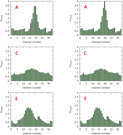 A similar behavior can be noticed by moving from the center position C downward to the outlet manifold. For position D (Figure S5), the influence of the ‘triangle’ shape can be noticed, which disturbs the distribution for the channels on the right side. Near the outlet manifold at position E, the distribution concentrates towards the six outlet channels. By comparing the graphs from position A and E, it can be noticed that the inlet and outlet zones differ slightly. For A, the flow distribution shows a sharp peak, whereas the distribution near the outlet is more heap-like. This may be caused by the different boundary conditions of the CFD simulation. At the inlet the velocity is described by a fixed value, whereas, at the outlet, the flow can leave the channel freely (zero gradient pressure outlet).