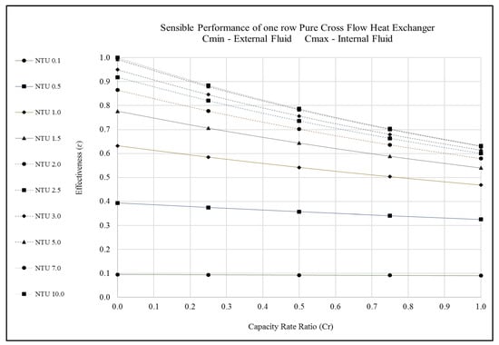 Performance predictions of a 1-row pure cross flow heat exchanger in terms of dimensionless parameters. Cmin—External Fluid Cmax—Internal Fluid; sensible heat transfer.