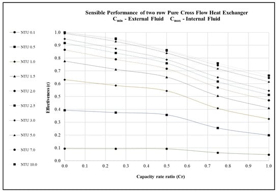 Performance predictions of a 2-row pure cross flow heat exchanger in terms of dimensionless parameters. Cmin—External Fluid Cmax—Internal Fluid; sensible heat transfer.
