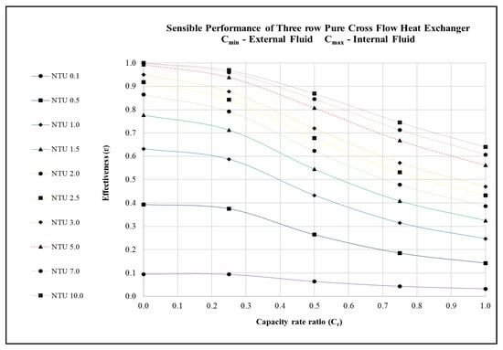 Performance predictions of a 3-row pure cross flow heat exchanger in terms of dimensionless parameters. Cmin—External Fluid Cmax—Internal Fluid; sensible heat transfer.