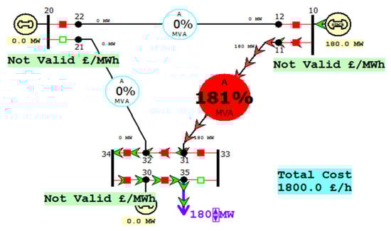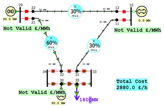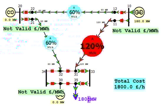 The operations and activities performed on physical systems should be in such a way that led to the least cost incurred. As shown in Figure 7, if two generators are simultaneously tripped, the transmission lines are still under the safe range of values. However, this scenario will increase the cost from 1800 GBP/h to 2880 GBP/h since the scenario creates a long path, which causes an increase in the overall cost.